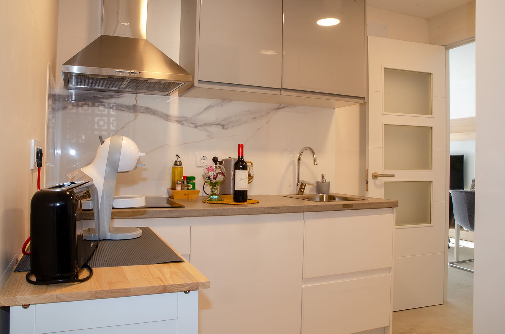 Die Wohnung liegt im zweiten Stock eines Mehrfamilienhauses, in einer Fussgängerzone mit Restaurants, Bars und Geschäften.