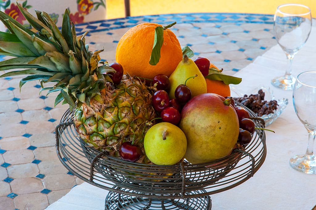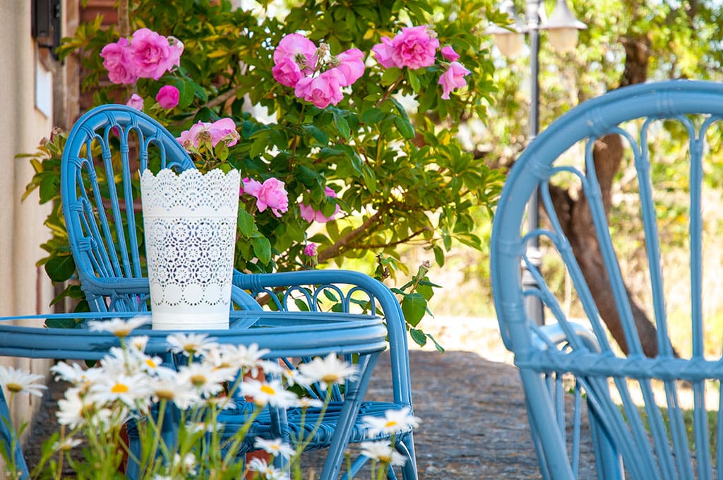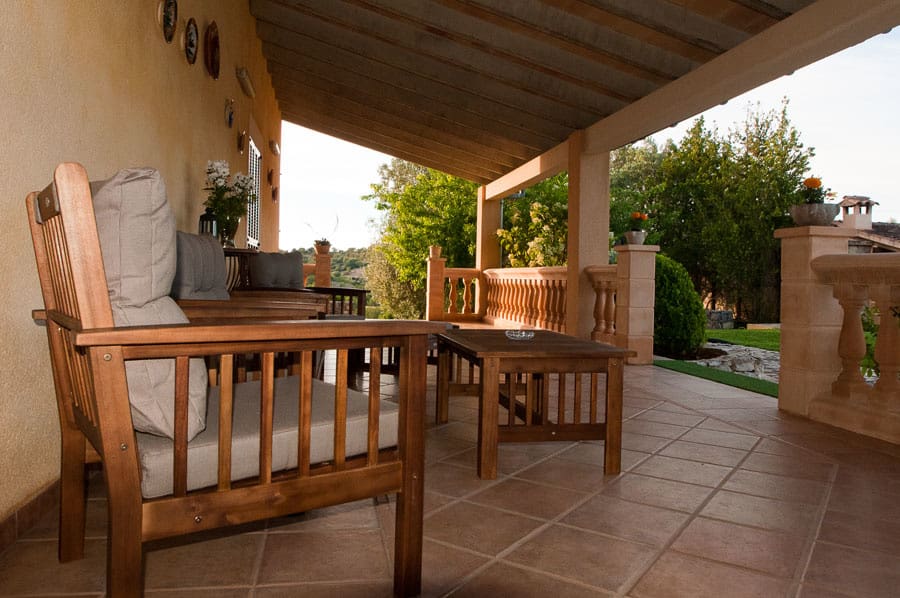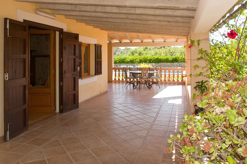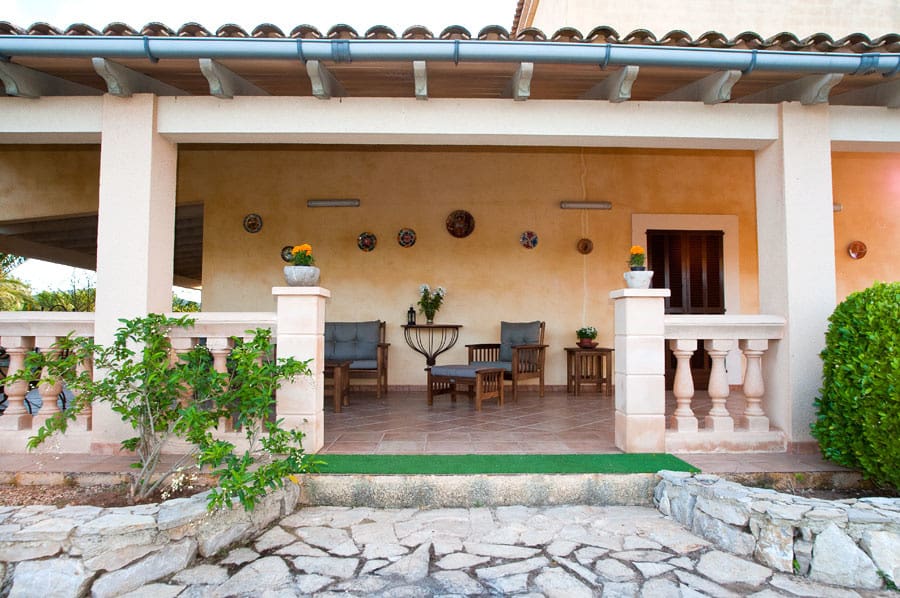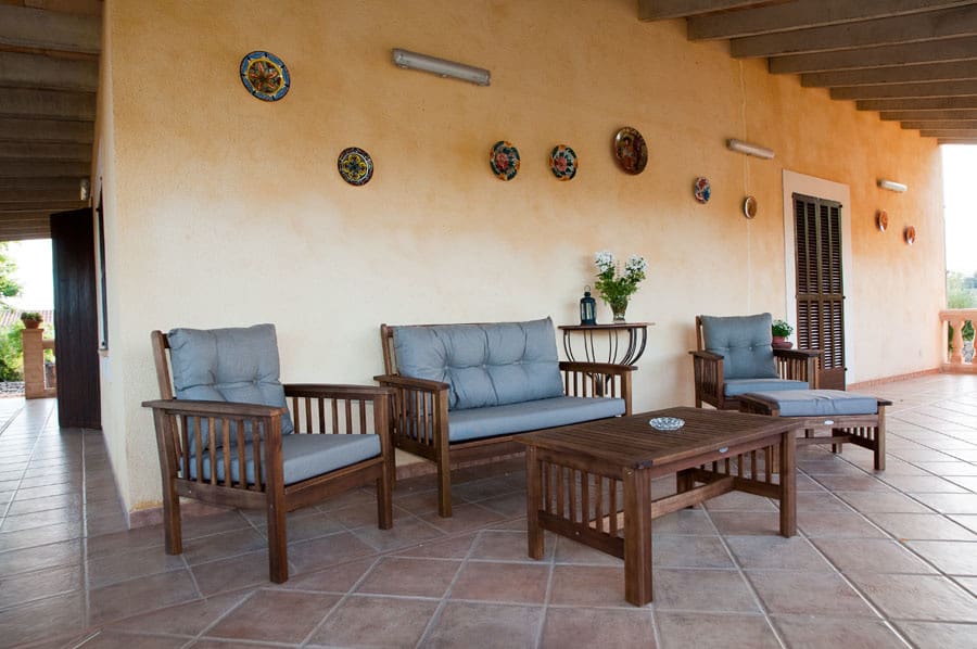 Vom Parkplatz zum Haus gehen Sie vorbei an Palmen und über die große Veranda, die sich über zwei Seiten des Hauses erstreckt. Hier steht ein runder Steintisch und Liegestühle. Während der heissen Sommermonaten ist es hier immer angenehm kühl.